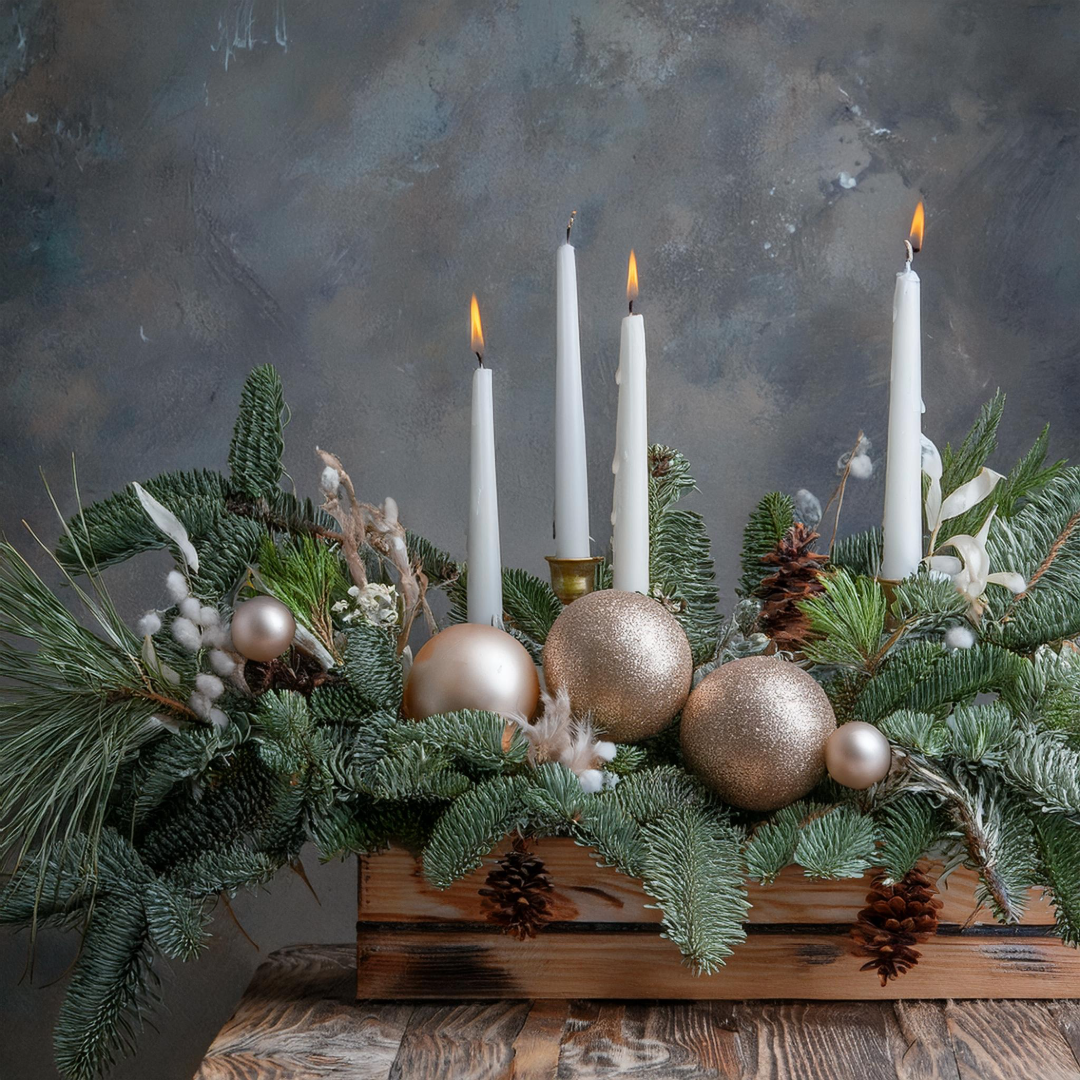 Besonderheiten: Elegante und klassische Adventsgestaltung mit vier weißen Kerzen