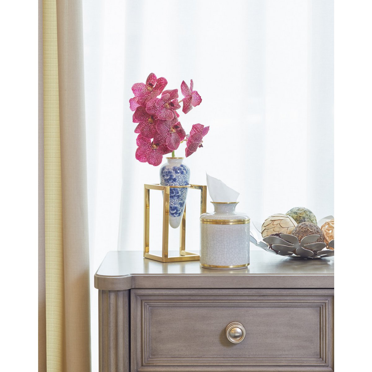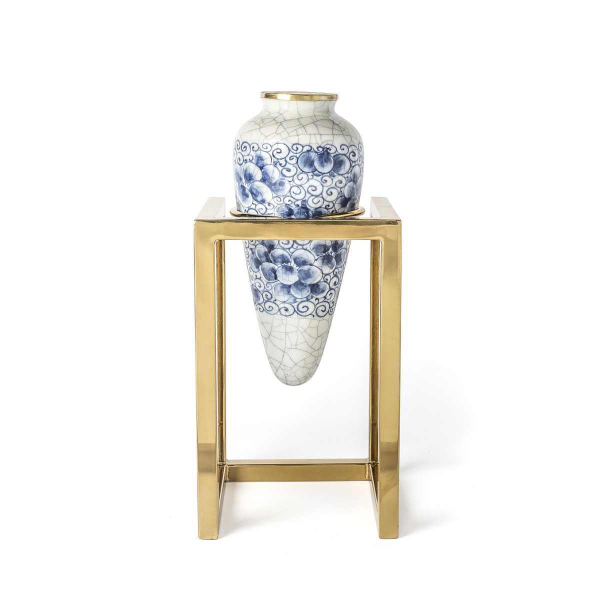 Diese Vase vereint traditionelles Design in kreativer Form mit einem modernen Sockel aus dunkelgoldenem Edelstahl. Die Karottenvase besteht aus handgeformter Keramik, die mit traditionellen asiatischen Mustern rund um die Vase und einem Hauch von Goldbesatz an der Oberseite bemalt ist. Es ist definitiv ein Statement-Stück für jeden Raum, es kann überall platziert werden.