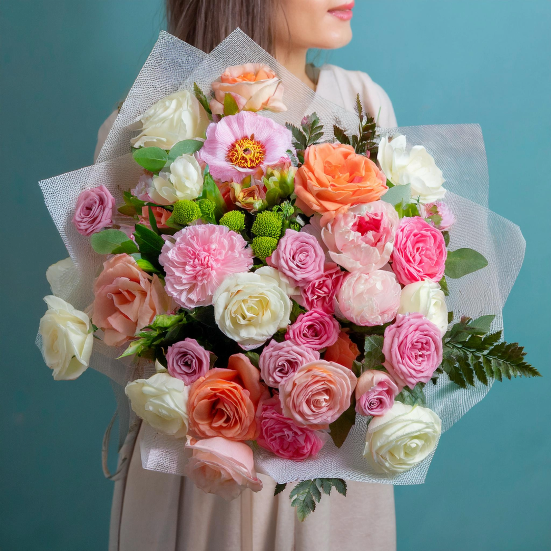 Ein Bouquet voller Leichtigkeit und Farbenfreude! Dieses Arrangement vereint zarte Pastelltöne mit einem Hauch von Lebendigkeit durch frische Akzente in Grün. Eine Komposition aus Rosen, Nelken, Pfingstrosen und weiteren Blüten, die Eleganz und Frische harmonisch verbindet – perfekt für unvergessliche Momente.