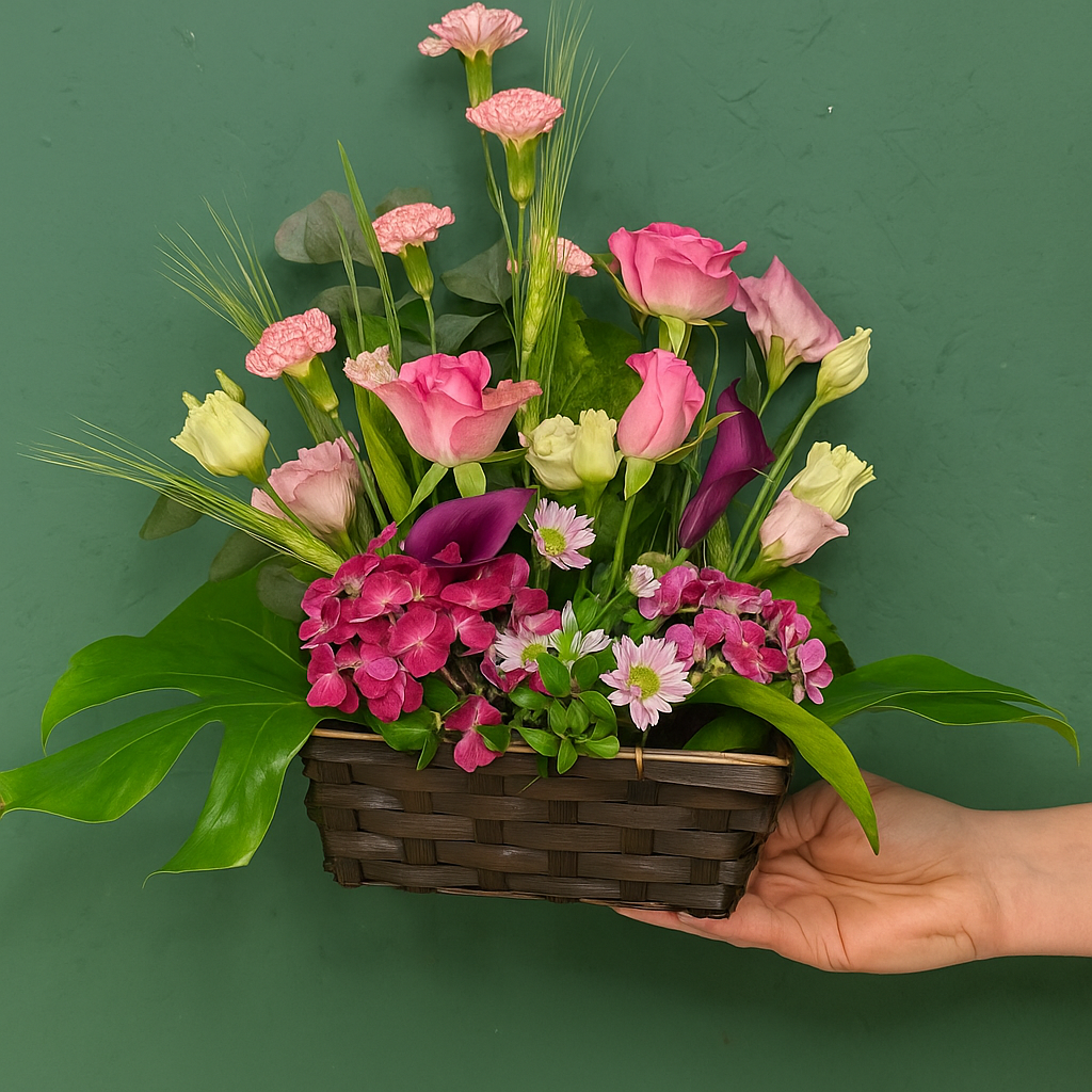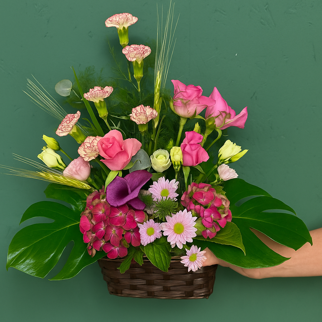 Diese elegante Blumenkorb-Komposition vereint verspielte Sommerfarben mit tropischem Flair. Rosa Rosen, zart gemusterte Nelken, Calla in tiefem Violett und hellgrüne Lisianthusblüten sorgen für romantische Akzente. Hortensien und Chrysanthemen bringen Volumen und Struktur, während exotische Monstera-Blätter und Gerstengräser einen frischen, modernen Touch verleihen. Ideal als Geschenk für fröhliche Anlässe oder als sommerliches Highlight im Wohnraum.