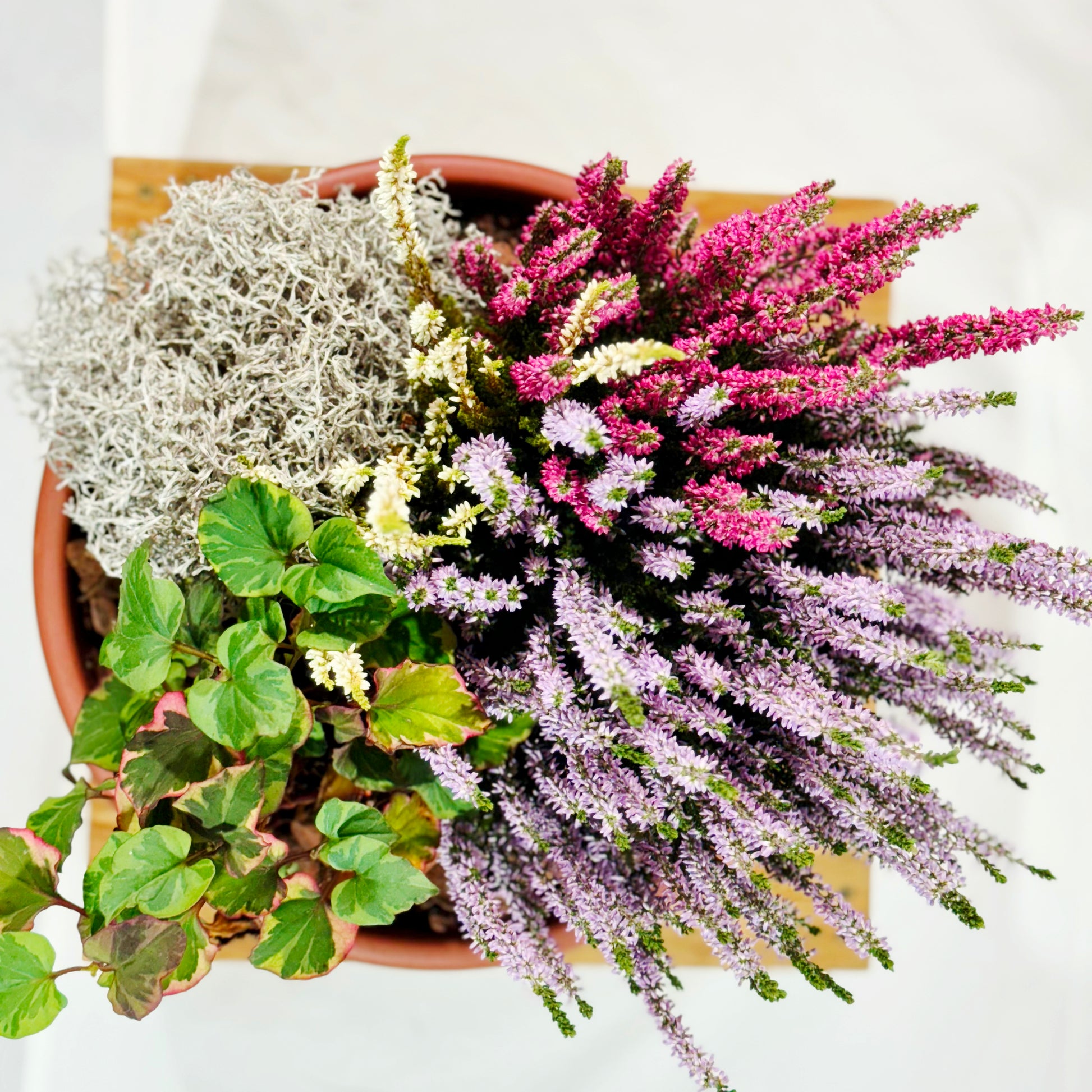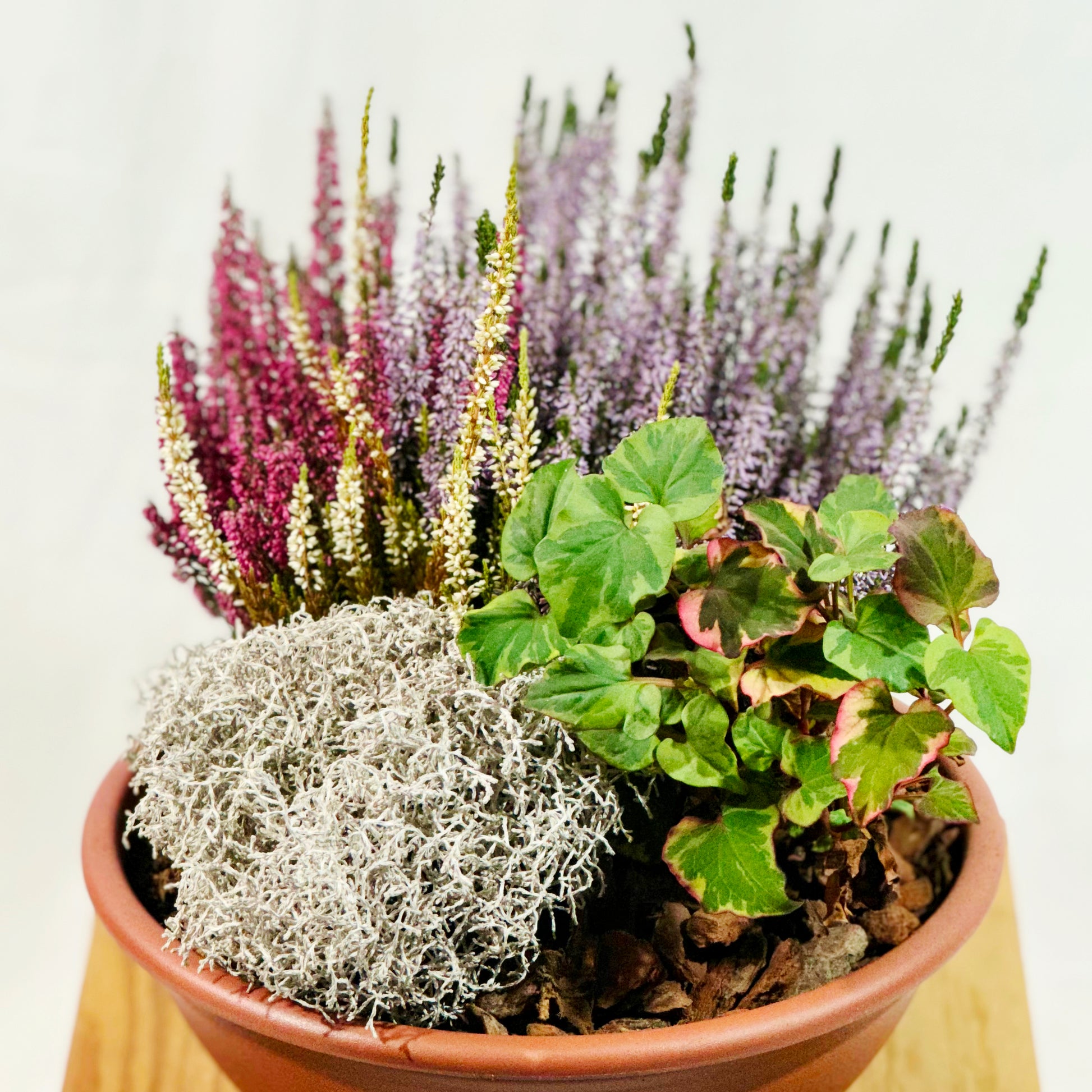 Unser herbstlicher Pflanzmix bringt die leuchtenden Farben des Herbstes direkt in Ihr Zuhause oder Ihren Garten! Diese wunderschöne Kombination aus verschiedenen Herbstpflanzen – darunter Heidekraut (Calluna), silbernes Moos und bunte Begonien – verleiht jedem Außenbereich oder Fensterbrett eine warme, einladende Atmosphäre. Perfekt als herbstliche Deko für Terrasse, Balkon oder den Hauseingang!
