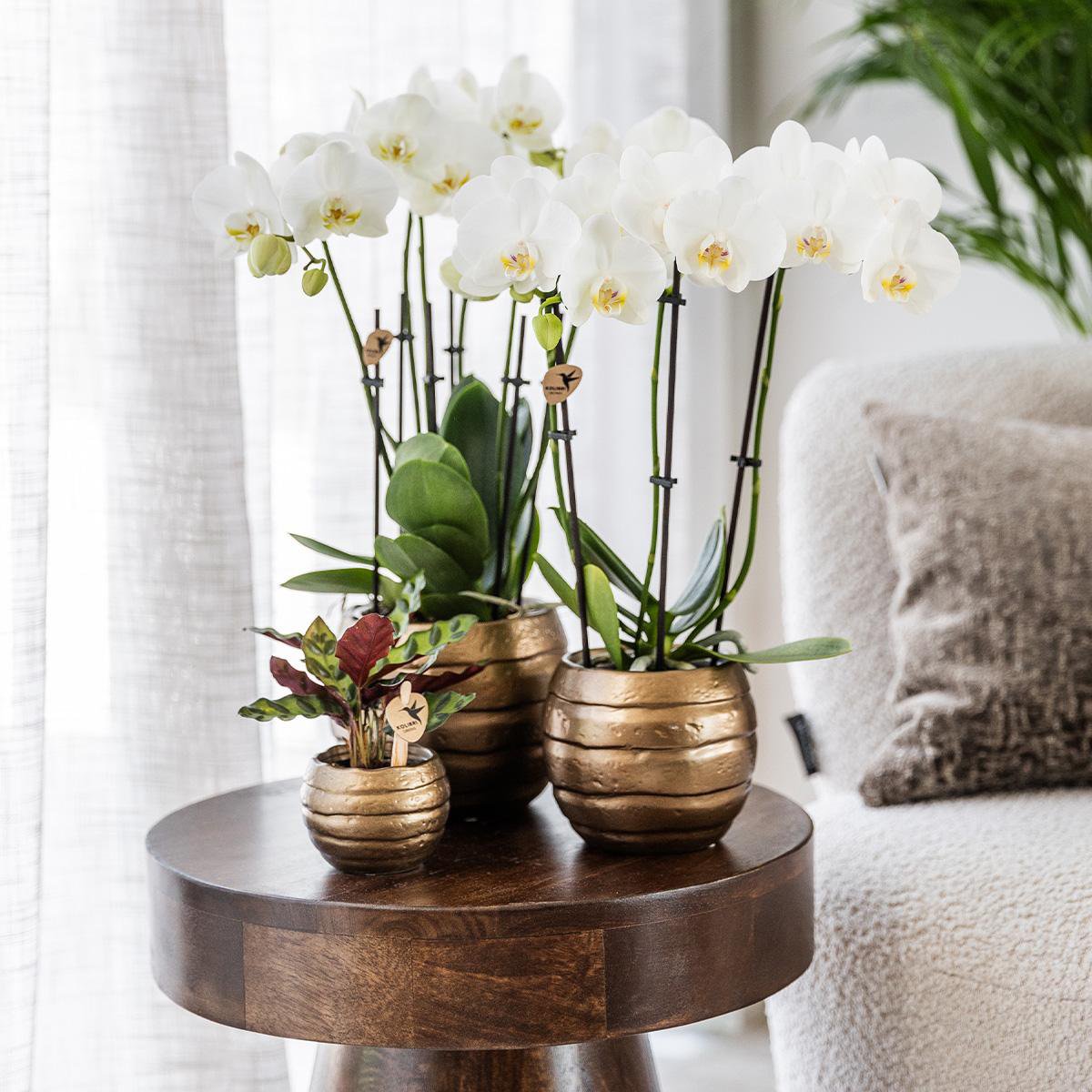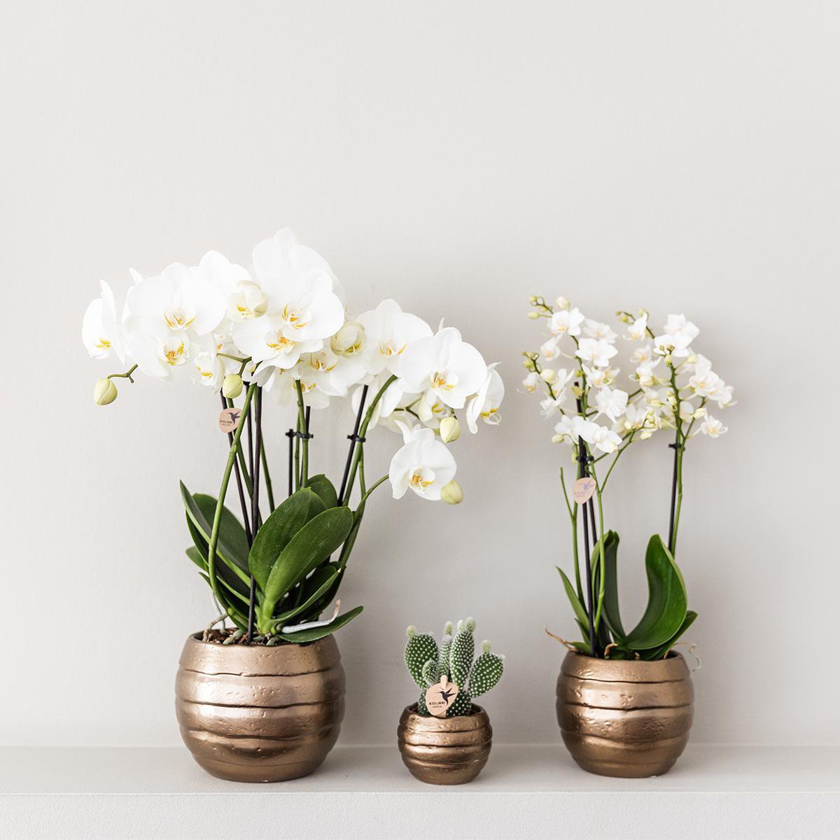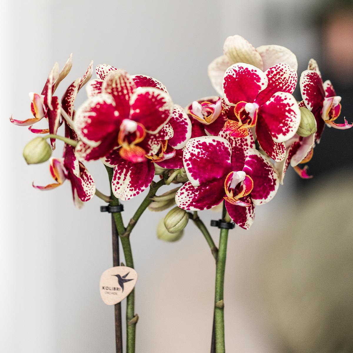 Entdecken Sie die atemberaubende Schönheit der spanischen Orchidee mit 2 oder 3 Zweigen, jetzt erhältlich in Kombination mit dem Bee-Topf. Mit ihren wunderschönen Rot- und Gelbtönen auf den Blüten ist diese Orchidee ein echter Hingucker in jedem Interieur. Bringen Sie mit dieser einzigartigen Kombination Stil in Ihr Zuhause. Bestellen Sie noch heute und genießen Sie die zeitlose Schönheit der spanischen Orchidee mit dem Bee-Topf. Pflege der Orchidee: Gießen Sie Ihre Orchidee einmal pro Woche, indem Sie den wachsenden Topf in Wasser tauchen. Anschließend lassen Sie die Orchidee gut abtropfen, bevor Sie die Zimmerpflanze wieder in den Dekotopf einsetzen. Wählen Sie einen hellen Standort, aber nicht in der direkten Sonne, mit Raumtemperaturen zwischen 18 und 21 Grad. Stellen Sie die Orchidee außerdem nicht in die Nähe eines Herdes oder einer Heizung. Verpackung und Lieferung Unsere Pflanzen werden direkt von unserer Gärtnerei an Sie versendet. Sie werden in einem speziell entwickelten Versandkarton verpackt, der dafür sorgt, dass Pflanzen und Töpfe beim Versand nicht beschädigt werden. Die Orchidee wird je nach Verfügbarkeit mit 2 oder 3 stabilen Zweigen geliefert. Da wir mit lebenden Produkten arbeiten, kann es zu kleinen Abweichungen in der Anzahl der Zweige oder Blüten kommen.