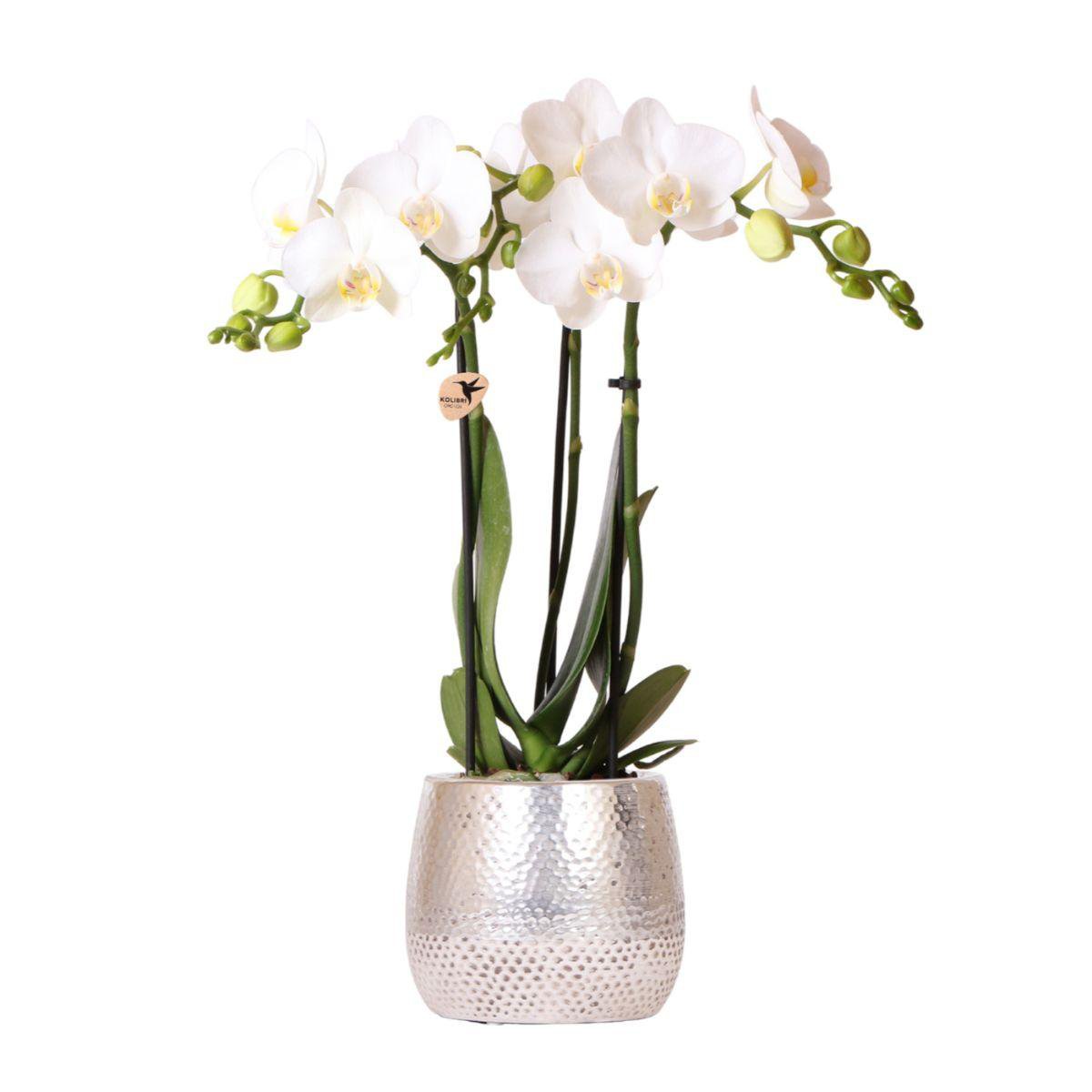 Kolibri-Orchideen | weiße Phalaenopsis-Orchidee - Amabilis + Elite-Topf silber - Topfgröße Ø9cm - 35cm hoch | blühende Zimmerpflanze – frisch vom Züchter