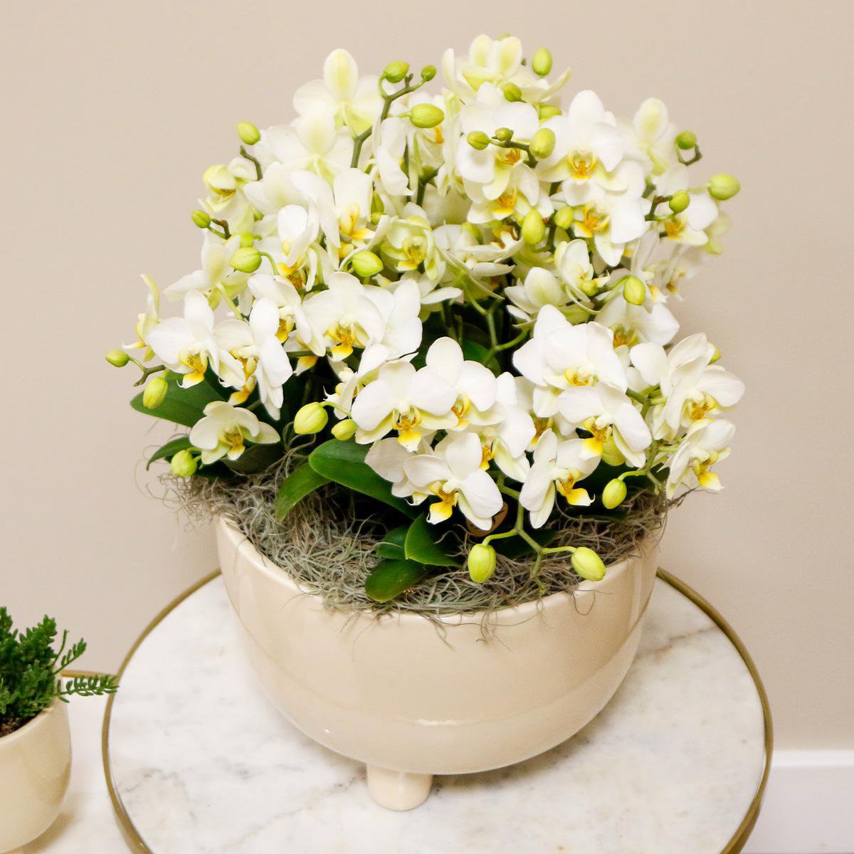 Kolibri-Orchideen | weißes Pflanzenset in Gummischale inkl. Wasserreservoir | drei weiße Orchideen | Mono Bouquet weiß mit autarkem Wasserreservoir