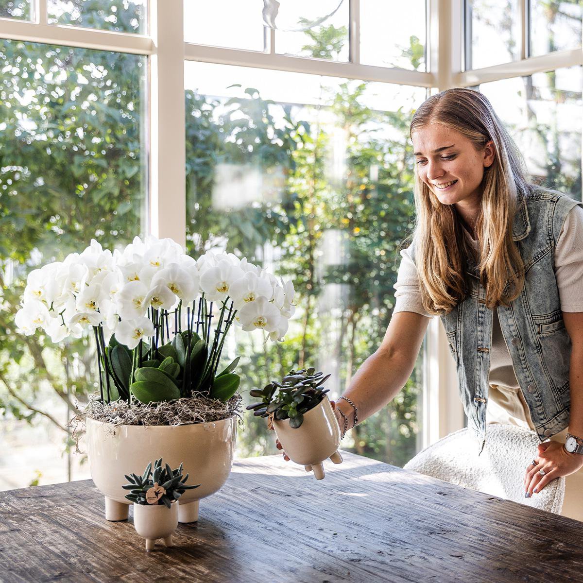 Kolibri-Orchideen | weißes Pflanzenset in Gummischale inkl. Wasserreservoir | drei weiße Orchideen | Mono Bouquet weiß mit autarkem Wasserreservoir