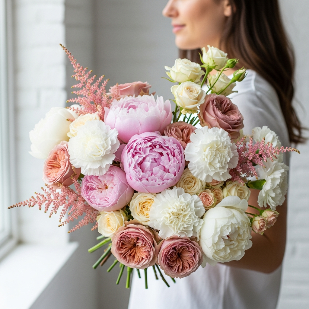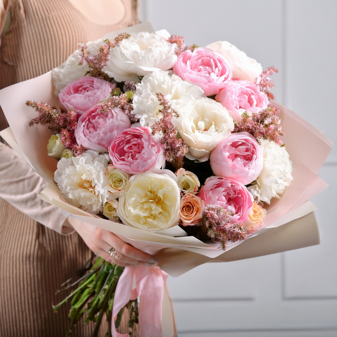 Dieser atemberaubende Blumenstrauß vereint üppige Pfingstrosen in zarten Rosa- und Weißtönen mit cremefarbenen Gartenrosen, apricotfarbenen Sprayrosen und filigranen rosafarbenen Astilben. Die voluminösen Blüten verleihen dem Arrangement eine luxuriöse und romantische Ausstrahlung, perfekt für Hochzeiten, Jubiläen oder als elegantes Geschenk. In zartem Papier mit rosafarbenem Band liebevoll verpackt, ist dieser Strauß ein edler Blickfang, der klassische Eleganz mit moderner Frische verbindet – ein florales Statement für besondere Momente.
