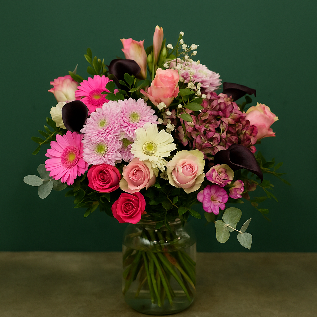 Ein ausdrucksstarker Strauß in kräftigen Rosé-, Lila- und Creme-Tönen – mit Rosen, Chrysanthemen, Gerbera, Calla und Hortensien. Diese Komposition ist sowohl romantisch als auch modern und bringt frische Energie in jeden Raum. Ideal als Geschenk für Geburtstage, Jubiläen oder um einfach Freude zu bereiten.