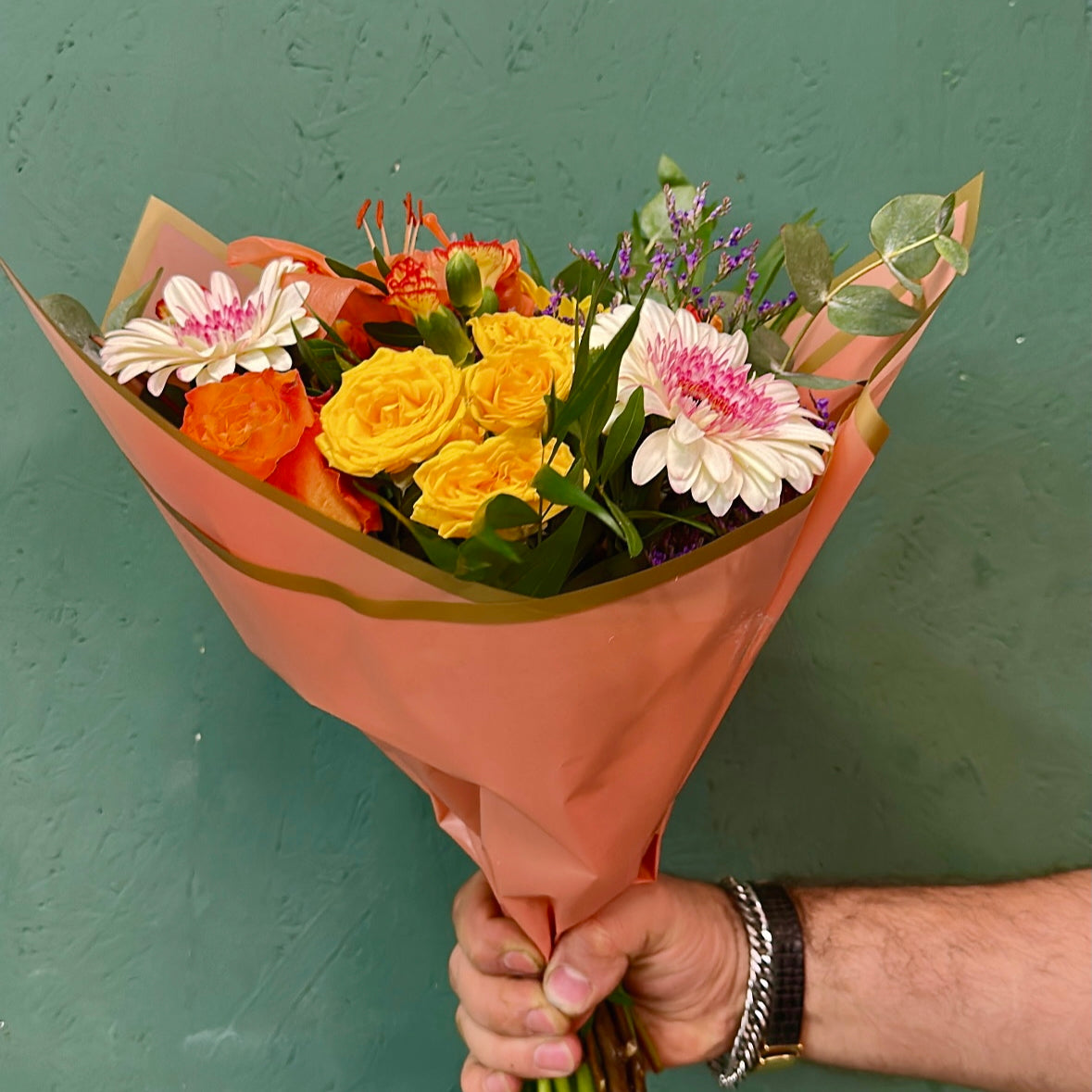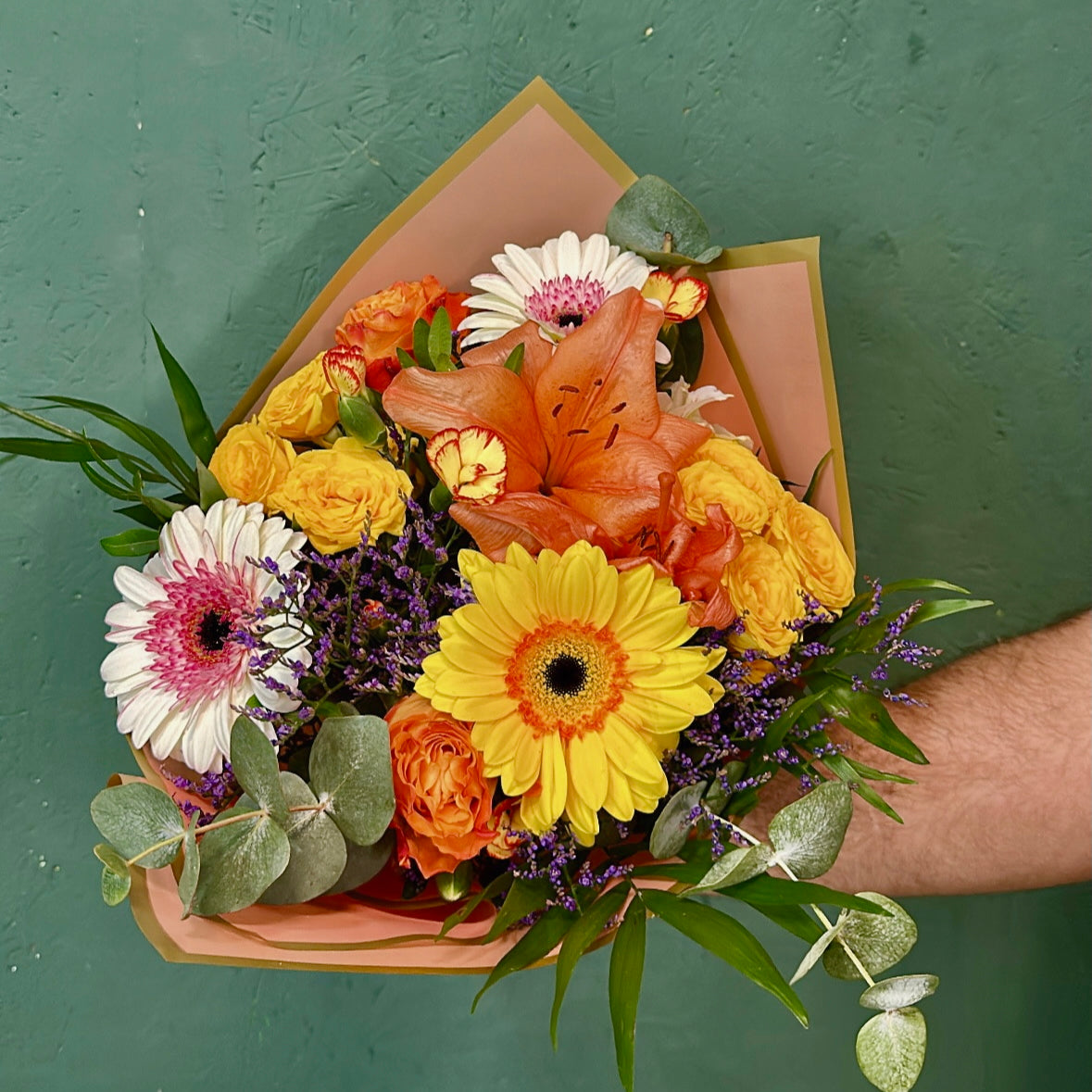 Ein farbenfrohes Bouquet aus Gerbera, Lilien, Rosen und Statice bringt die Wärme und Lebendigkeit des Sommers direkt ins Zuhause. Perfekt für jeden, der Farbe und Freude schenken möchte