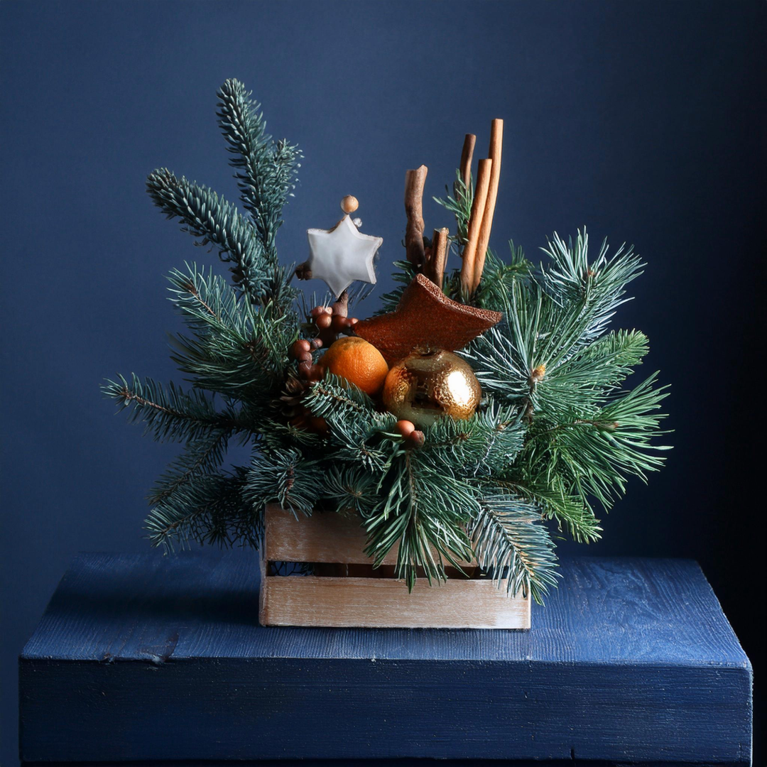 Ein elegantes Weihnachtsgesteck aus frischen Tannenzweigen und weihnachtlicher Dekoration. Perfekt für Tisch oder Fensterbank – stimmungsvoll und stilvoll zugleich.