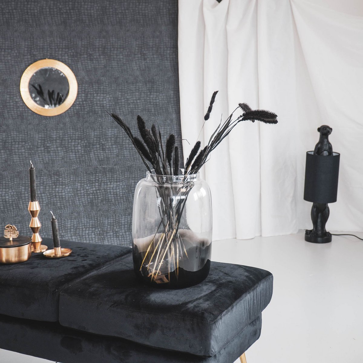 Vasenzeit! Es gibt nicht zu viele Vasen. Diese Glasvase mit schwarzen und weißen Punkten hat eine tolle große Form für alle Arten von großen Blumen und Feldsträußen. Es ist eine unverzichtbare Vase für große Blumensträuße und Zweige. Wichtige Eigenschaften: – Aus Glas – Größe: 25 x 35 cm. Styling-Tipp: Platzieren Sie alle Ihre Lieblingsblumen darin und schneiden Sie sie in verschiedene Höhen: Sie erhalten eine Partyvase!