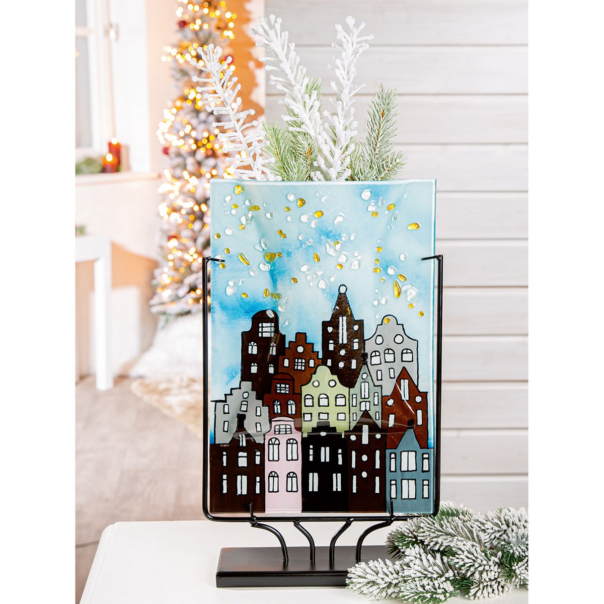 Diese stilvolle rechteckige Vase namens "Stadtlichter" ist ein einzigartiges Kunstwerk, handbemalt auf Glas. Mit einem charmanten Hausmotiv in den Farben Grau, Hellblau und Schwarz wird sie zum Blickfang in jedem Raum. Ihre glänzende Oberfläche strahlt Eleganz aus. Bitte beachten Sie, dass die Vase nicht wasserdicht ist und daher nur zur Dekoration verwendet werden sollte. Mit Maßen von 10 x 27 x 45 cm ist sie perfekt für jeden Wohnraum geeignet. Ein echtes Highlight für Ihr Zuhause!