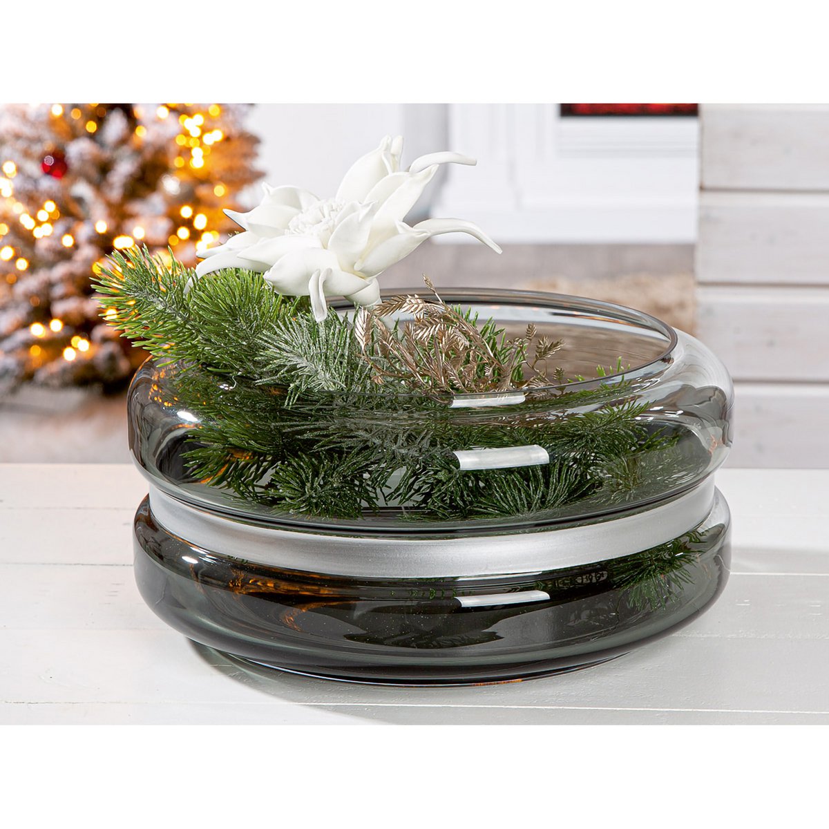 Holen Sie sich mit dieser handgefertigten grauen Glasvase einen Hauch von Eleganz in Ihr Zuhause. Die durchgefärbte Optik und der silberne Streifen verleihen ihr eine edle Note. Mit einem Durchmesser von 32,5 cm und einer Höhe von 15,5 cm bietet sie genügend Platz für Ihre Lieblingsblumen. Gönnen Sie sich dieses stilvolle Accessoire für Ihre Wohnräume.