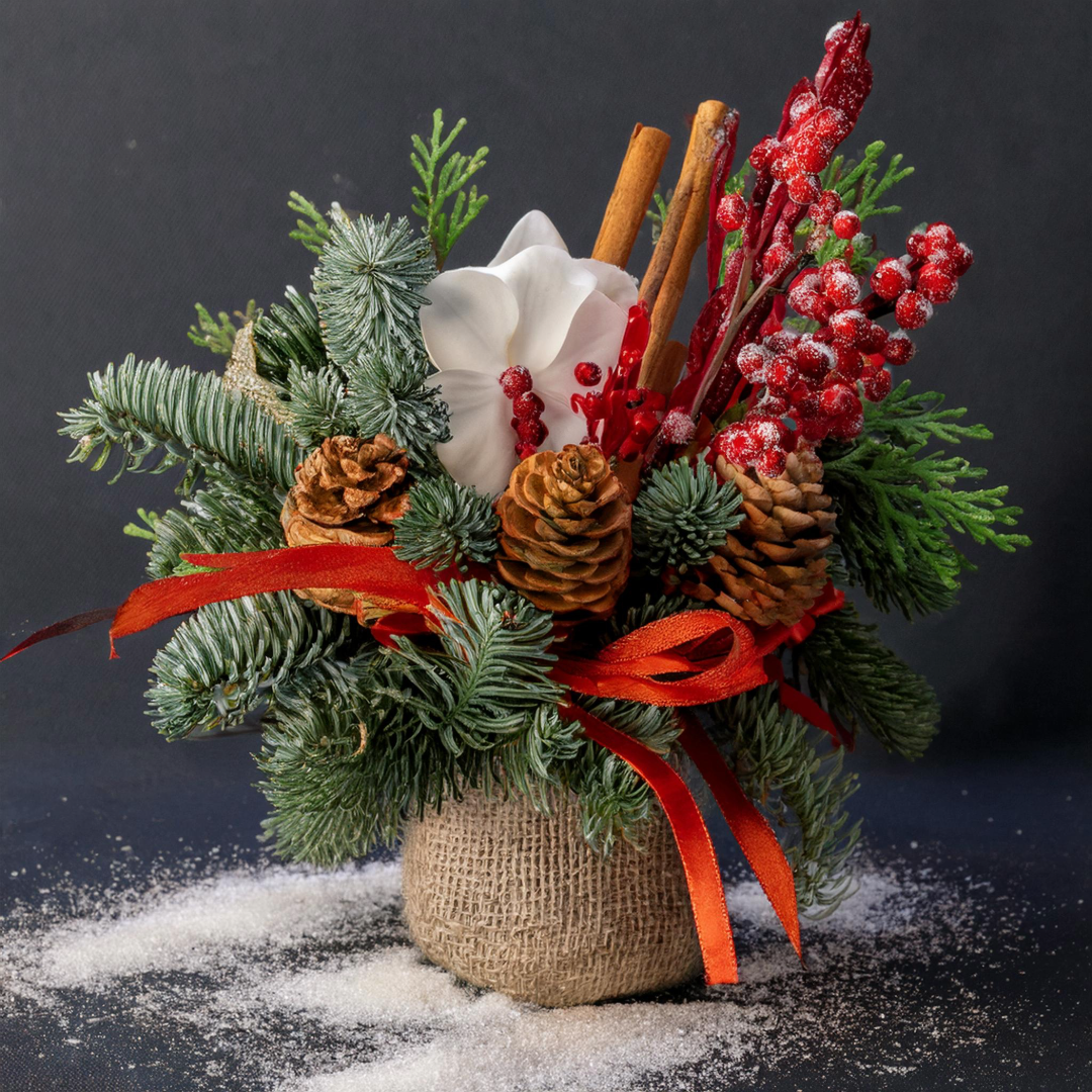 Dieses rustikale Weihnachtsgesteck verleiht Ihrem Zuhause eine gemütliche Festtagsstimmung. Die Kombination aus natürlichen Elementen wie Kiefernzapfen und Zimtstangen wird durch rote Beeren und Schleifen ergänzt, während die Schneeeffekte den Winterzauber betonen.